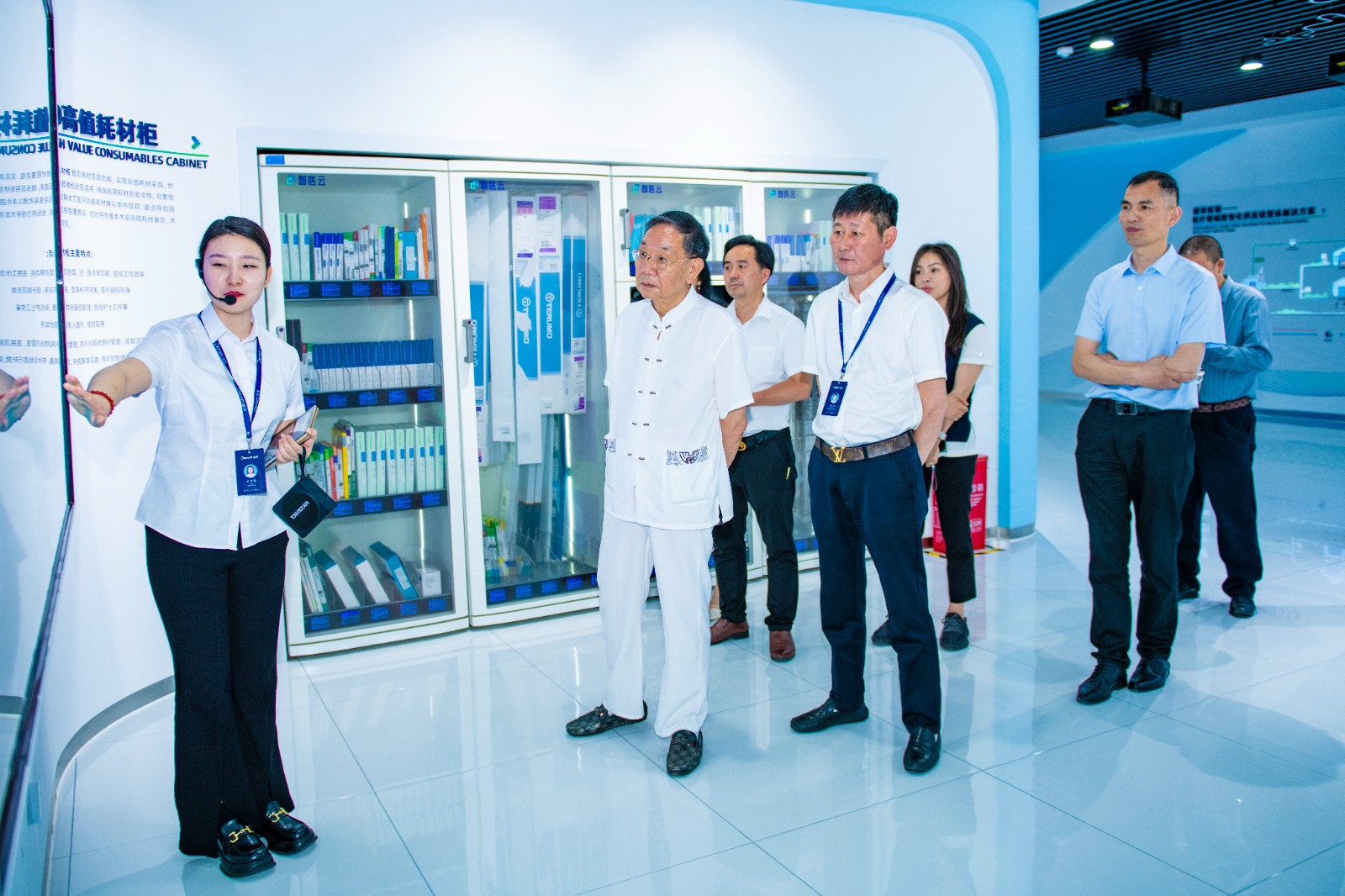 曾垂甲一行首先參觀了德榮數(shù)智科技館,聽取德榮醫(yī)療從醫(yī)療器械經(jīng)銷商轉(zhuǎn)變?yōu)獒t(yī)療器械供應(yīng)鏈運營商的發(fā)展歷程,以及德榮在供應(yīng)鏈服務(wù)、商業(yè)流通和器械研發(fā)生產(chǎn)三個方面的未來規(guī)劃。緊接著,考察團來到了湖南省面積最大的醫(yī)療器械單體倉庫-德榮智倉,實地觀摩了“一倉三庫”體系和SPD院外倉,詳細了解德榮醫(yī)療器械一體化供應(yīng)鏈(德榮醫(yī)鏈)的運營流程。